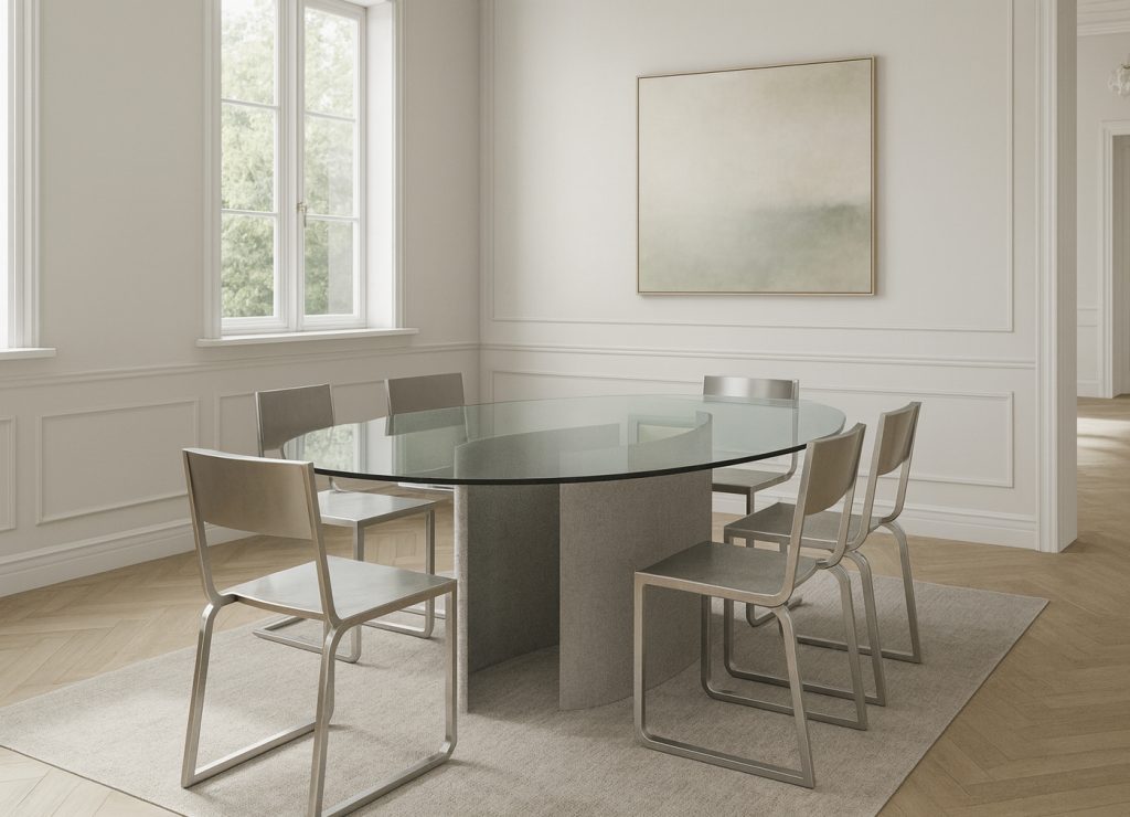 Il tavolo Virgola è un pezzo iconico dal carattere deciso e minimalista. La sua struttura curva, bianca e fluida, ricorda il gesto elegante di una virgola su carta: un segno che separa, ma allo stesso tempo unisce. La base scultorea, realizzata in materiale solido e resistente, sostiene un piano in vetro ovale trasparente che dona leggerezza e ampiezza visiva all’ambiente.