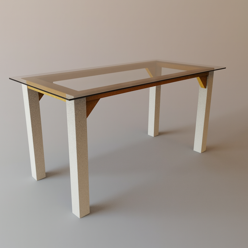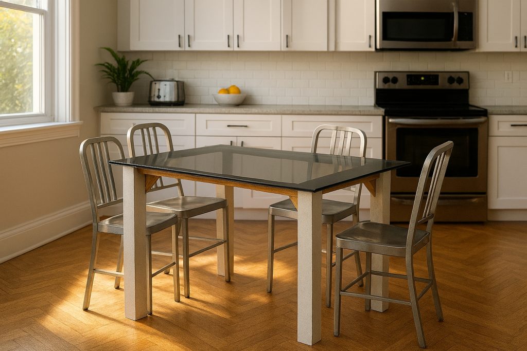 The tempered glass top floats above robust solid surface legs, creating a visual tension that feels both grounded and ethereal. A handcrafted solid wood frame, with exposed joints and artisanal detailing, adds warmth and soul, anchoring the piece in tradition.