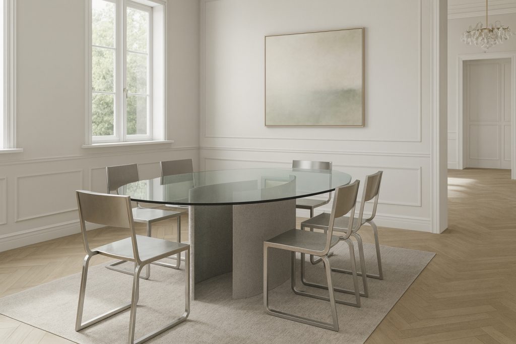 Crafted from solid, enduring materials, the base supports a transparent oval glass top that amplifies light and expands visual depth, creating a harmonious dialogue between form and function. Virgola is not just a table—it’s a punctuation mark in the language of design.