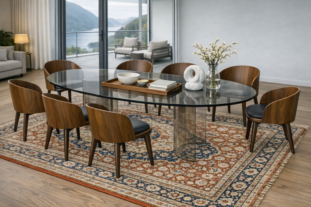 The Miami Table carries the rhythm of the sea within its design. Its transparent tempered glass top reflects light like the surface of calm waters, expanding the sense of space with luminous clarity. Beneath, the sculptural base in transparent tempered glass with the grace of a wave—sinuous, continuous, and full of motion.